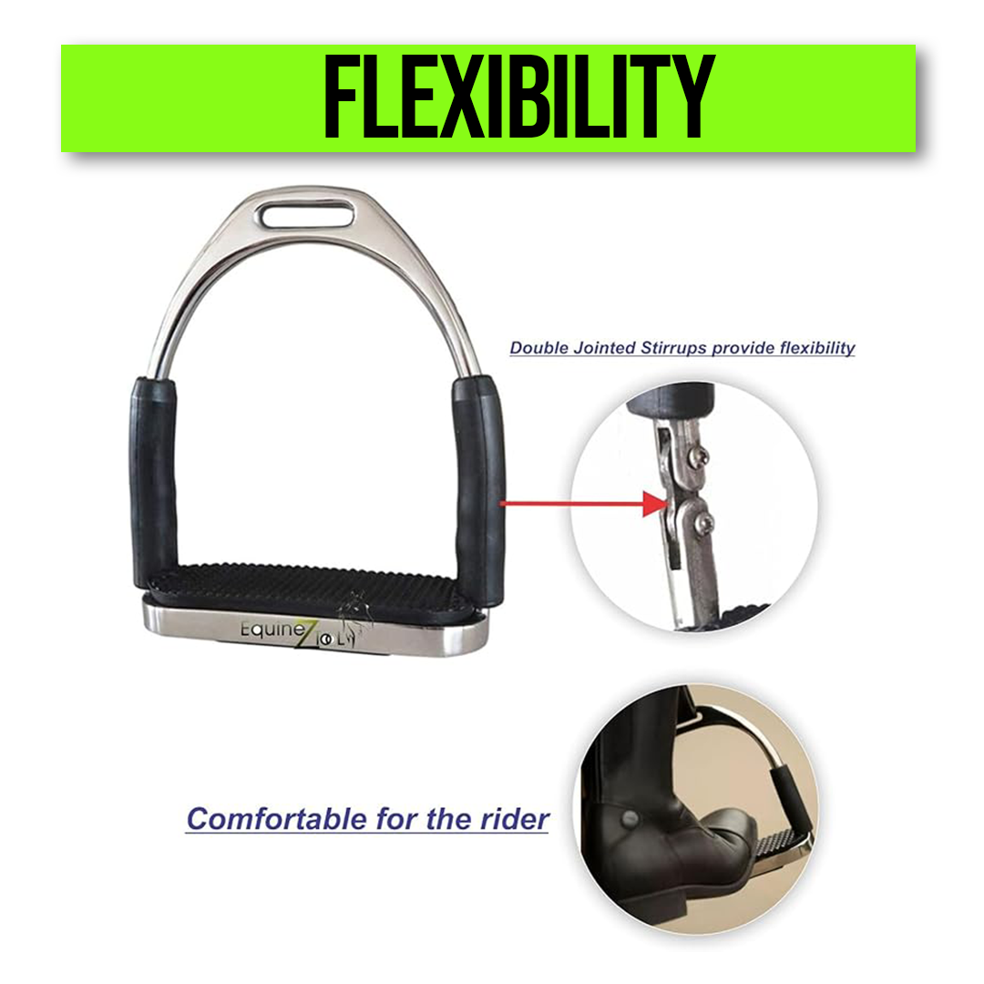 - ⇛PREMIUM BUILD WITH FLEX STAINLESS STEEL: Crafted from flex stainless steel, these 2PC English saddle stirrups offer superior strength, corrosion resistance, and long-lasting durability, making them ideal for both casual riders and professional equestrians.